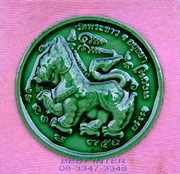 ด้านหน้าเป็นสิงห์มหาบารมี เคลือบสีเหลือง-เคลือบสีเขียว ทรงกลมขนาด 3.3 ซ.ม.