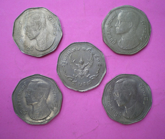 เหรียญนิเกิ้ล ชนิดราคา ๕ บาท รัชกาลที่ ๙ ด้านหลังรูปครุฑพ่าห์ เก้าเหลี่ยม พ.ศ. ๒๕๑๕ สภาพสวย รวม ๕ เหรียญ หายาก ราคา ชุดละ 100 บาท (w.820)