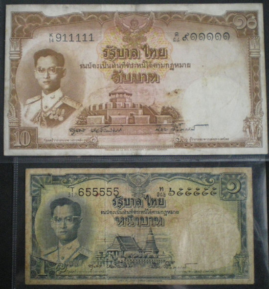 ธนบัตร ชนิดราคา ๑๐ บาท และ ๑ บาท สมัยรัชกาลที่ ๙ แบบ ๙ เลขสวยเกือบตอง หมายเลข ๙๑๑๑๑๑ และ ๖๕๕๕๕๕ สภาพผ่านการใช้งาน หายาก ราคา คู่ละ 700 บาท (w.967)