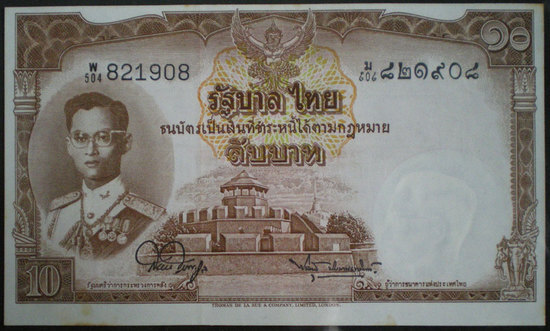 ธนบัตร ชนิดราคา ๑๐ บาท สมัยรัชกาลที่ ๙ แบบ ๙ แบงค์ตลก ตัดสูงเกือบชิดขอบบน หมายเลข ๘๒๑๙๐๘ สภาพสวย UNC. หายาก ราคา ฉบับละ 500 บาท (w.968)