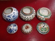 - จานเชิง 3 ใบ 3 แบบ ขนาด 4 นิ้ว เป็นเบญจรงค์เนื้อกังไส ส่วนขนาด 3 นิ้วกับ 5 นิ้วเป็นเนื้อดินอยุธยาหายากครับ