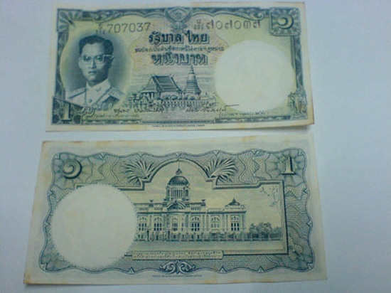 ธนบัตรหนึ่งบาท แบบ 9 เลขดำ ลายน้ำรัชกาลที่ 9 ลายเซ็นต์ สุนทร-ป๋วย สภาพดี มีเหลืองตามขอบพอสมควร ประมาณในรูป ขาย "ยกล็อต 47 ใบ" ในราคาใบละ 75 บาท
