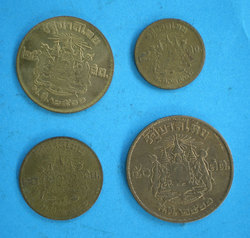 เหรียญบรอนซ์ทอง ชนิดราคา ๕๐ สต. ๒๕ สต. ๑๐ สต. และ ๕ สต. รัชกาลที่ ๙ ด้านหลังตราแผ่นดิน พ.ศ. ๒๕๐๐ สภาพสวยมาก ผิวเดิม หายาก ราคา ชุดละ 100 บาท (w.739)
