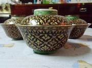 - ชามฝาเบญจรงค์ลายน้ำทองลายพุ่มข้าวบิณฑ์พื้นดำ(กบิลดำ) ชุด 3 ใบ(ขายแล้วครับ) ขนาด 4.75 นิ้ว มีเส้นยาวประมาณ 1 ซม.ที่ฝาหนึ่งใบนอกนั้นสวยสมบูรณ์ครับ