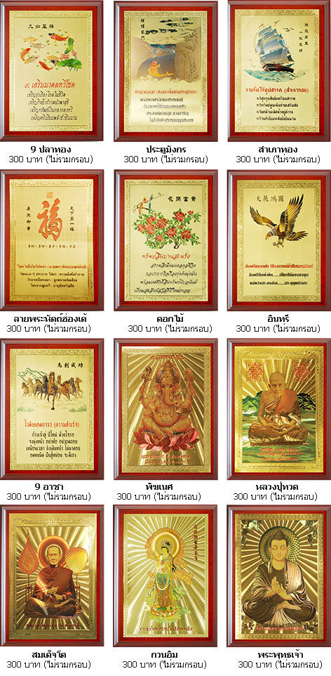 แผ่นทองพิมพ์นูนสีขนาด A4 - 9 ปลาทอง, ประตูมังกร, สำเภาทอง, ลายพระหัตถ์ฮ่องเต้, ดอกไม้, อินทรี, 9 อาชา,พิฆเนศ, หลวงปู่ทวด,สมเด็จโต, กวนอิม, พระพุทธเจ้า