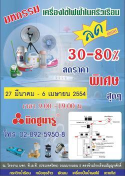 ลดราคาตั้งแต่ 30-80% อาทิกระติกน้ำร้อนไฟฟ้า หม้อหุงข้าวไฟฟ้า เตารีดไฟฟ้า พัดลมและเครื่องปั่นน้ำผลไม้ ม็อบปั่นแห้ง โคมดักแมลงแบบใหม่ ราวแขวนเสื้ออเนกประสงค์