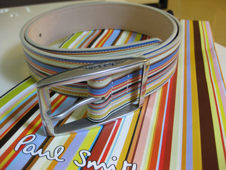 ของใหม่ ไม่ได้ใช้ เพิ่งซื้อมาจากอังกฤษ ลาย Multi Strip สีรุ้ง Signature ของ Paul Smith หัวเข็มขัดเป็นโลหะสีเงิน เขียน Pual Smith