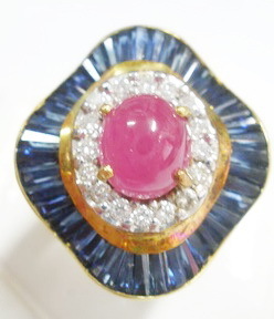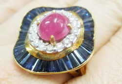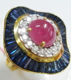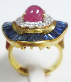 แหวนวงนี้ฝังทับทิมหลังเบี้ยตรงกลางฝังหนามเตย 4 หนาม และล้อมด้วยเพชรเกสรฝังหนามร่วม ส่วนรอบนอกล้อมแทปเปอร์ไพลินเรียงเป็นแบบพลิ้วทั้งหน้า
