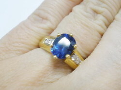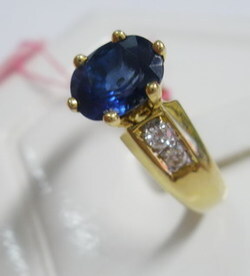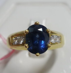 แหวนวงนี้ฝังไพลินเจียตรงกลางฝังหนามเตย 6 หนามชู และก้านฝังเพชรเกสรแบบจิก
