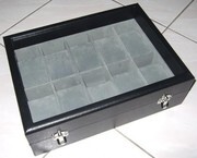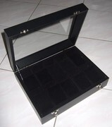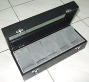 กล่องสะสมนาฬิกาใหม่มือหนึ่ง เป็นกล่องไม้หุ้มด้วยหนังสีดำ ภายในบุกำมะหยี่ พร้อม หมอนรัดนาฬิกา มี 3 สี สีแดง สีดำ และสีเทา ฝาเป็นกระจกใส