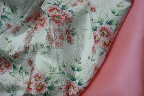 ผ้าไหมพิมพ์ลายดอกไม้สีโอโรส + ผ้าพื้นสีโอโรส ตัดเป็นชุดสวยมากค่ะ