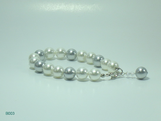 @@@ สร้อยข้อมือมุกเปลือกหอย สีขาวสลับสีเทา ห้อยตุ้งติ้งน่ารักด้วยคริสตัสสวารอฟกี้สีขาวรุ้งหวานแหวว