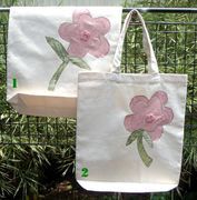 1. กระเป๋าผ้าลดโลกร้อน แบบหูหิ้วคู่ วัสดุผ้าใบเนื้อหนา สีขาวครีม ออฟไวท์ ประดับดอกไม้ผ้า ขนาด 17" x 20" มีเพียง 2 ใบ ใบละ 199 บาท