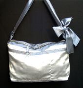 6. กระเป๋าสะพายผ้า #5 ผลิตจากผ้าแพรลายในตัว สีเงิน ด้านนอกมีช่องใส่ของ ซับในผ้าฝ้ายลายทางเทา-ดำ มีช่องใส่ของด้านใน สายผ้าป่านแก้วสีเทาเข้ม ปรับความยาวได้โดยผูกเป็นโบว์มีใบเดียว ขนาด กว้าง 15" x สูง 9" ราคา 300 บาท