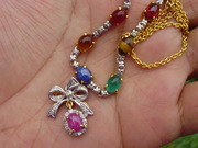 สร้อย คอเส้นนี้เป็นทองลายโซ่ และฝังพลอยหลังเบี้ยเม็ดละ กะรัตกว่า ๆ สลับกับเพชรกุหลาบฝังหนามเตย 4 หนาม และห้อยตุ้งติ้งด้วยทับทิมดอกไม้ โบว์เพชรกุหลาบแบบจิก