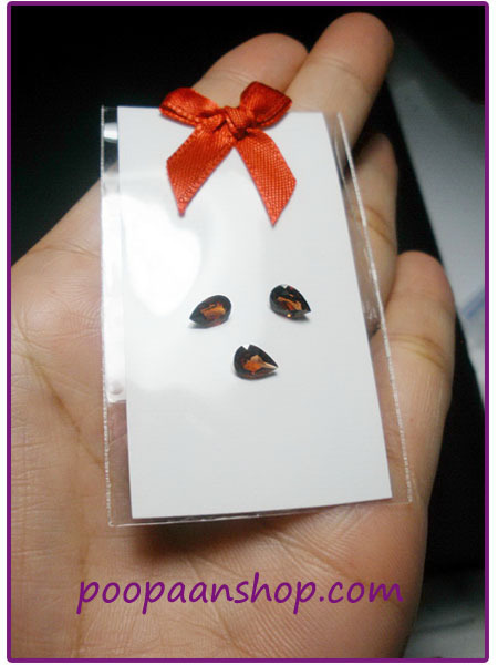 เราสั่งก้อนแร่เข้ามาจากประเทศในอัฟริกา และนำมาเจียรนัยโดยช่างผู้ชำนาญจากเมืองจันทบุรี ลักษณะเป็นรูปหยดน้ำ น้ำหนักรวมสามเม็ดประมาณ 1.50 กะรัต บรรจุในซองแก้วใสสวยงามพร้อมติดโบว์สีแดงสดใส