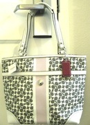 ขายกระเป๋า COACH KHAKI SIGNATURE HERITAGE STRIPE TOTE PURSE BAG 15137 ราคาถูกสุดๆ