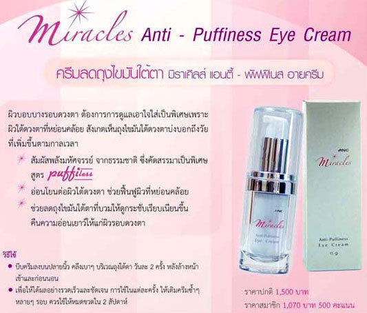 Miracles Anti - Puffiness Eye Cream ครีมลดถุงไขมันใต้ตา มิราเคิลส์ แอนตี้ - พัฟฟิเนส อายครีม ฟื้นฟูผิวที่หย่อนคล้อย ช่วยลดถุงไขมันใต้ตาที่บวมให้ดูกระชับเรียบเนียนขึ้น คืนความอ่อนเยาว์ให้แก่ผิวรอบดวงตา