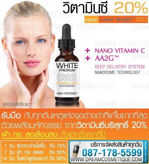 ซีรั่มวิตามินซี บำรุงผิวเข้มข้น 20% ลดฝ้า กระ สูตรนาโนเทคโนโลยี ให้คุณสมบัติแบบ All in One ด้วยคุณสมบัติพิเศษจากส่วนผสมไวท์เทนนิ่งล้ำหน้า Laser Bright™ C20 มีฤทธิ์ฟอกสีผิว (Beaching Effect) ทำให้จุดด่างดำ ฝ้า กระและความหมองคล้ำจางลงอย่างรวดเร็ว เห็นผลอย่างชัดเจนในเวลาเพียง 1 สัปดาห์***
