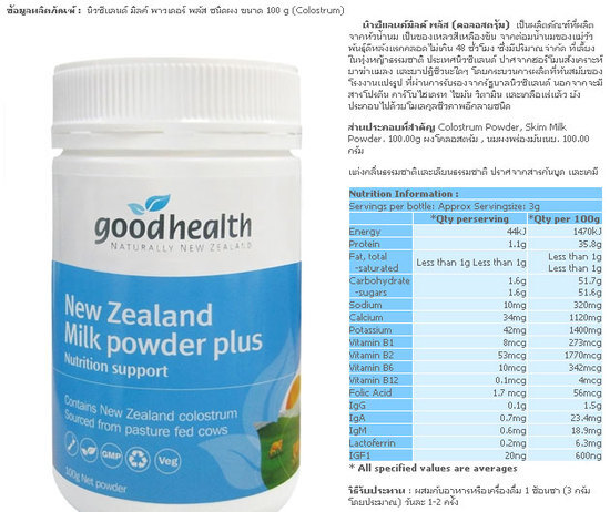 ส่วนประกอบที่สำคัญ Colostrum Powder, Skim Milk Powder. 100.00g ผงโคลอสตรัม , นมผงพร่องมันเนย. 100.00 กรัม