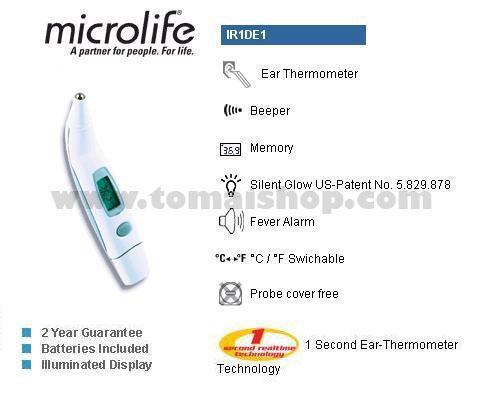 อินฟราเรด เทอร์โมมิเตอร์ รุ่น IR1DE1-1 ภายใต้ลิขสิทธิ์ microlife สำหรับวัดอุณหภูมิภายในร่างกายและอุณหภูมิภายนอก ได้ผลรวดเร็วแม่นยำเพียง 1 วินาที โดยใช้วัดไข้ทางช่องหู ใช้งานง่ายเพราะเป็น Probe Cover Free จึงทำให้ไม่เสียค่าใช้จ่ายเพิ่ม ทำให้มีความปลอดภัยสูง เพื่อความสะดวกและถูกสุขอนามัย เหมาะสำหรับวัดไข้เด็กและผู้ใหญ่ ด้วยเทคโนโลยีใหม่ล่าสุด microlife จึงได้ออกแบบเทอร์โมมิเตอร์อินฟราเรดให้มีคุณสมบัติพิเศษดังนี้