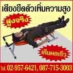 ข่าวดีสำหรับผู้ที่อยากสูงหรือผู้ที่มีอาการปวดหลังปวดคอหมอนรองกระดูกทับเส้นประสาท นวัตกรรมใหม่ของการเพิ่มความสูงโดยใช้เตียงยืดตัวซึ่งเป็นที่นิยมในหลายประเทศในขณะนี้ เป็นอุปกรณ์สำหรับยืดตัวทำให้ตัวสูงขึ้น สูงขึ้น หากทำอย่างต่อเนื่อง โดยใช้หลักการเดียวกับการโหนบาร์ สามารถช่วยดึงและยืดตัวให้เราสูงขึ้นสูงขึ้นจนเพื่อนๆสงสัย สูงเร็วและเห็นผลจริง ! อย่างเห็นได้ชัด ใช้งานง่ายนอนดูทีวีอยู่กับบ้านก็ทำได้ด้วยตัวเอง ทำเพียงวันละ 15-20 นาที แถมยังช่วยแก้อาการปวดหลังปวดคอเนื่องจากการกดทับของกระดูกทับเส้นประสาท เครื่องยืดตัวนี้จะช่วยบำบัดอาการปวดหลัง คอ ไหล่และขา จากการทำกิจวัตรประจำวันต่างๆ เช่น ยกของหนัก นั่งทำงานนานๆ นั่งขับรถ นานๆอยู่เป็นประจำ หรือเล่นกีฬาที่ใช้กล้ามเนื้อด้านเดียวเป็นหลัก เช่น กอล์ฟ เทนนิส โบว์ลิ่ง กิจกรรมเหล่านี้ทำให้กล้ามเนื้อเกิดอาการเครียด เกร็ง หรืออักเสบและทำให้เกิดแรงกดทับบนหมอนรองกระดูกเพิ่มมากขึ้นในระดับหนึ่ง ทำให้กดทับเส้นประสาทเป็นผลทำให้เกิดอาการปวดเรื้อรัง ปวดร้าวด้านใดด้านหนึ่ง เครื่องยืดตัวหรือเครื่องดึงหลังนี้ ช่วยบำบัดอาการโดยหลักของการยืดหมอนรองกระดูกและกล้ามเนื้อในเวลาเดียวกัน เช่นเดียวกับการทำกายภาพบำบัดในโรงพยาบาล ให้ผลลดแรงกดบนหมอนรองกระดูกและลดความเครียดของกล้ามเนื้อได้อย่างรวดเร็ว ช่วยบำบัดให้ค่อยๆดีขึ้นจนไม่จำเป็นต้องผ่าตัดหลังมาหลายรายแล้ว นอกจากนั้นยังให้ประโยชน์จากศาสตร์ของการจัดเรียงกระดูกที่เรียกว่าไคโรแพรกติก (Chiropractic) ที่ช่วยให้แนวของกระดูกสันหลังตรงขึ้น แก้อาการหลังค่อม หลังโก่ง กระดูกสันหลังคด ขาโก่ง ทำให้บุคลิกท่าทางดีขึ้น ใช้ได้กับทุกคนในครอบครัว ลักษณะการทำงานของเครื่องก็ใช้ง่ายโดยการนอนลงบนเตียงยืดตัวเอาเท้าสอดเข้าไปในที่สำหรับล็อคเท้า ล็อคลำตัวให้แน่นแล้วเอามือหมุนสำหรับยืดตัวจนได้น้ำหนักที่เราต้องการ จะรู้สึกตึงๆสบายๆที่ขาและบริเวณหลัง นอนทำตัวสบายๆอยู่บนเตียงประมาณ 15-20 นาทีเพียงวันละ 1 ครั้ง เราจำหน่ายเครื่องยืดตัวนี้ในราคาไม่แพงเนื่องจากเราพยายามลดค่าใช้จ่ายทางการตลาดลง จากราคา 12,500 บาท ลดลงเหลือ 8,900 บาท เป็นสินค้าที่มีคุณภาพ แข็งแรง ทนทานใช้งานได้นานหลายปีเนื่องจากกลไลต่างๆทำงานด้วยระบบmanualไม่มีระบบไฟฟ้าเลย และใช้งานง่าย รับประกันสินค้า 1 ปี