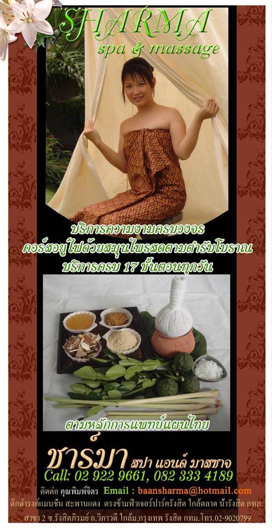 | ติดต่อ: | คุณพิมพ์จิตร( Sharma Spa & Massage) | อีเมล์: | |||