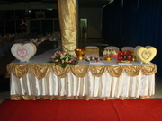 - จัดโต๊ะอาหาร ใช้ปูผ้า 2 ชั้น สวมปอกเก้าอี้ยาว ผูกโบว์ทอง ทุกโต๊ะ