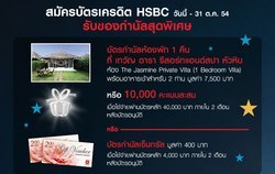 สมัครบัตรเครดิตHSBCรับบัตรกำนัลเซ็นทรัล/โลตัส 400 บาทหรือ บัตรกำนัลห้องพักที่ เทวัญ ดารา รีสอร์ทแอนด์สปา หัวหิน 7,500บาท หรือ รับ 10,000 คะแนนสะสม วันนี้ - 31 ต.ค. 54