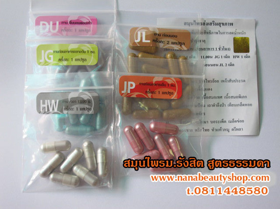 1.สมุนไพรลดความอ้วนสูตรธรรมดาทานแล้วจะทำให้รู้สึกอิ่ม ลดการดูดซึมไขมัน ช่วยเร่งระบบเผาผลาญ ที่สำคัญเป็นสมุนไพรที่มีส่วนปรับสมดุลธาตุให้กับร่างกาย 1 ชุดทานได้ 1 อาทิตย์ จะสามารถลดน้ำหนักได้ 1-2 กิโลจะมีตัวยา 5 ตัว ( DU JG JP HW JL )ราคา165บาท