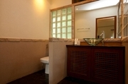 ห้องน้ำในบ้านสวนฟ้าใสแห่งนี้ ห้องหนึ่งอยู่ภายในห้องนอนชั้นล่าง ที่มีชาวเวอร์และอ่างล้างหน้า ห้องน้ำอีก 3 ห้องอยู่ภายในห้องนอนชั้นบน ที่พิเศษก็คือห้องน้ำในห้องนอนหลักเป็นห้องน้ำแบบกลางแจ้ง ห้องนี้แหละที่คุณจะได้ลองสัมผัสประสบการณ์ที่เรียกกันว่า "อาบลม-ห่มฟ้า" ของจริง ห้องครัว