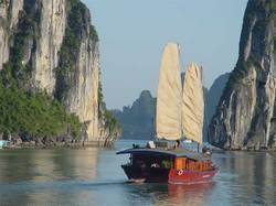 นำท่านออกเดินทางสู่ท่าเรือ เพื่อล่องเรือชมความงามตามธรรมชาติ ที่สรรค์ สร้างด้วยความงดงามดังภาพวาดโดยจิตกรเอก อ่าวฮาลองประกอบด้วยหมู่เกาะน้อยใหญ่กว่า 1,900 เกาะ และได้รับการประกาศเป็น “มรดกโลก”โดยองค์การยูเนสโก อ่าวแห่งนี้เต็มไปด้วยภูเขาหินปูนมากมาย ระหว่างการล่องเรือท่านจะได้ชมความงามของเกาะแก่งต่าง ๆ ทั้งเกาะหมา เกาะแมว เกาะไก่ชน ฯลฯ นำท่านชมถ้ำสวรรค์ ชมหินงอกหินย้อยมากมาย ล้วนแต่สวยงามและน่าประทับใจยิ่งนัก ถ้ำแห่งนี้เพิ่งถูกค้นพบเมื่อไม่นานมานี้ ได้มีการประดับแสงสีตามผนังและมุมต่าง ๆ ในถ้ำ ซึ่งบรรยากาศภายในถ้ำท่านจะชมความสวยงามตามธรรมชาติที่เสริมเติมแต่งโดยมนุษย์ แสงสีที่ลงตัวทำให้เกิดจินตนาการรูปร่างต่าง ๆ มากมาย ทั้ง รูปมังกร เสาค้ำฟ้าทั้ง 4 เสา รูปปีกอินทรี รูปนางฟ้า รูปคู่รักหนุ่มสาว พระพุทธรูป ฯลฯ ตลอดจนเลือกซื้อสิ้นค้าที่ระสึกต่างๆ ตามอัธยาศัยได้เวลาอันสมควรนำท่านกลับสู่เรือเพื่อเดินทางกลับสู่ท่าเรือฮาลอง