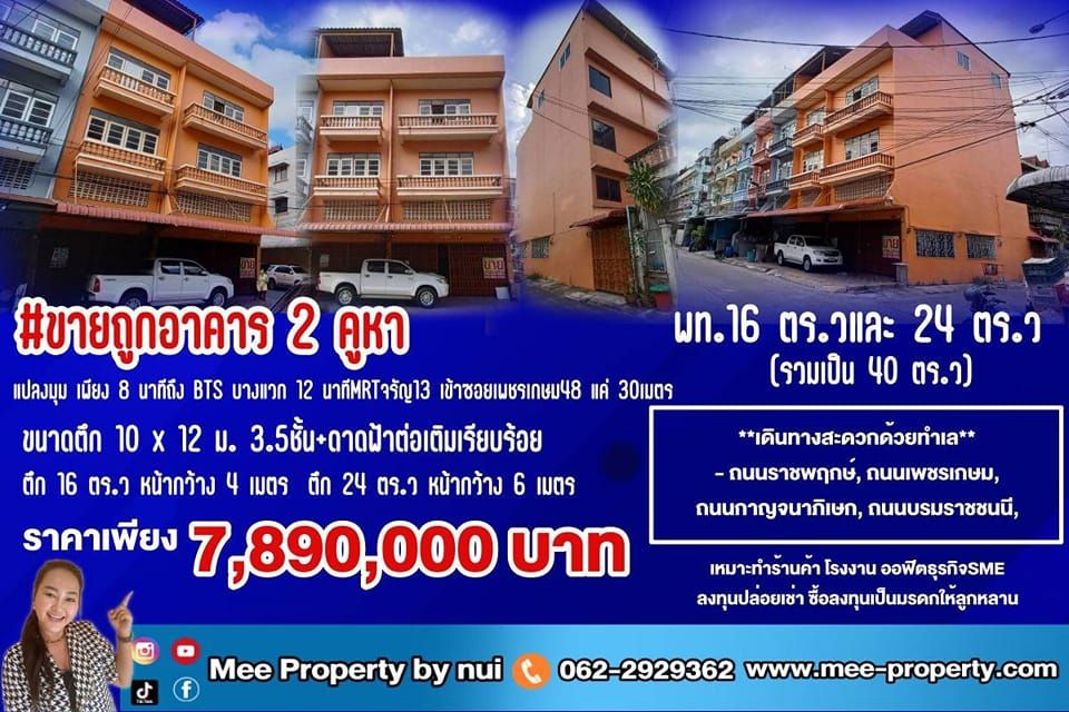 ขายถูกอาคาร 2 คูหา แปลงมุม ใกล้BTS บางแวกพท.16 ตร.วและ 24 ตร.ว (รวมเป็น 40 ตร.ว)