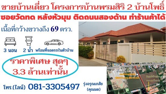 ขายบ้านเดี่ยว โครงการบ้านพรมสิริ 2 บ้านโพธิ์ สร้างใหม่เนื้อที่ 69 ตรว. ติดถนนสองด้าน ทำร้านค้าได้ ต.หนองตีนนก อ.บ้านโพธิ์ จ.ฉะเชิงเทรา