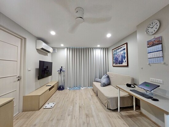 ห้องนั่งเล่นกว้างขวาง พร้อมมุมทำงาน มีโต๊ะทำงาน 2 ตัว สำหรับ Work From Home