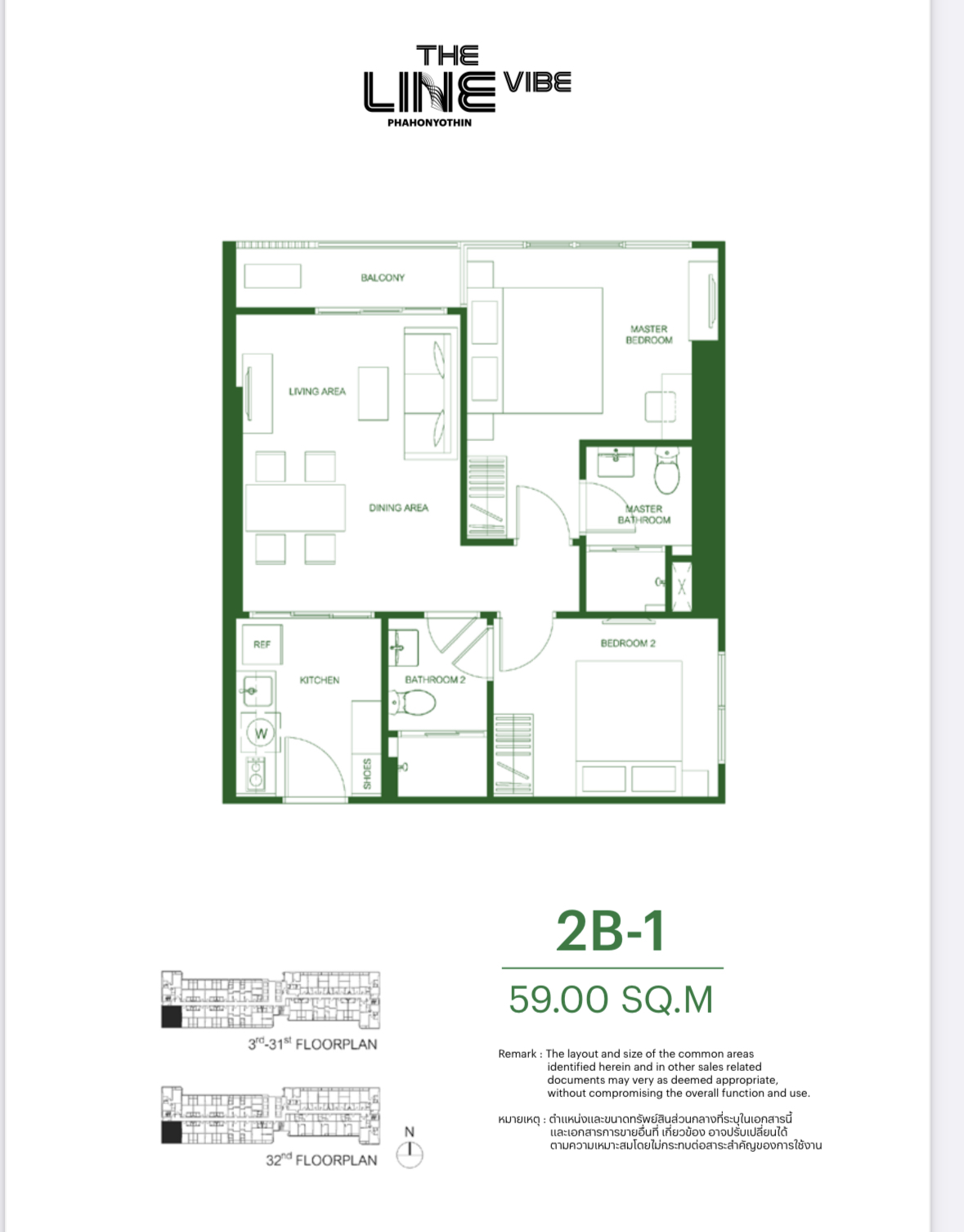 ขายดาวน์ The Line Vibe แบบ 2 ห้องนอน 2 ห้องน้ำ (2B-1) ขนาด 59 ตรม. ชั้น 32 ทิศใต้