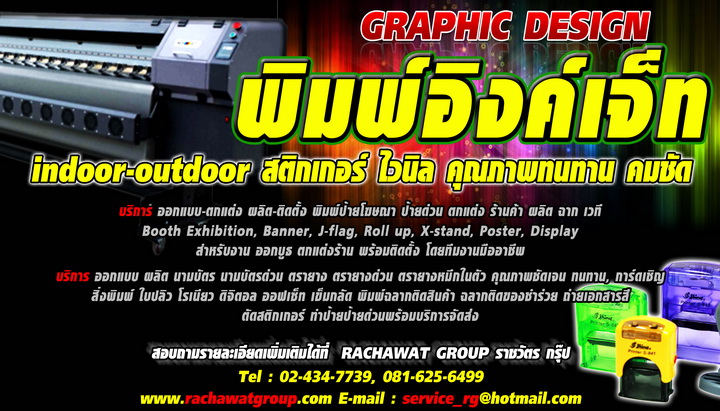 บริการ ออกแบบ ผลิต ติดตั้ง พิมพ์ป้ายโฆษณา พิมพ์ป้ายด่วน ป้ายไวนิล พิมพ์สติกเกอร์ Inkjet Printing, Sticker INDOOR-OUTDOOR สำหรับตกแต่งร้านค้า ห้างร้าน บริษัทฯ Booth Exhibition, Banner, J-Flag, Roll Up, X-Stand, Poster, Display โดยเน้นคุณภาพ ชัดเจน ทนทาน