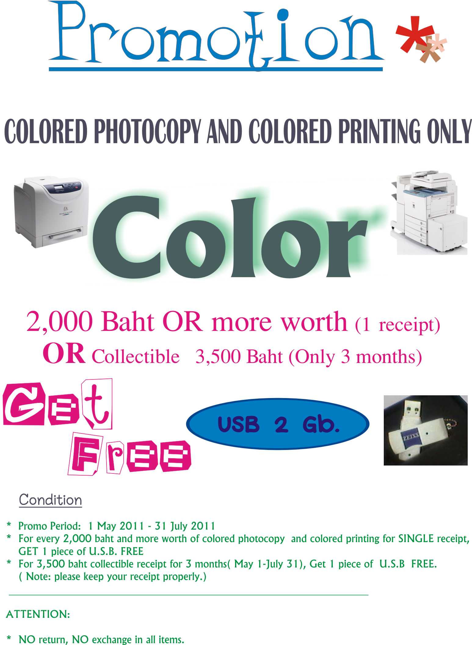 Promotion ถ่ายเอกสาร Print สี กับเราวันนี้ ยอดบิลตั้งแต่ 2,000 บาท ขึ้นไป รับฟรี Flash drive 2 Gb. หรือสะสมยอดครบ 3,500 บาท ภายใน 3 เดือน (1 พ.ค. 54 – 31 ก.ค. 54) สามารถได้รับสิทธิเช่นกัน