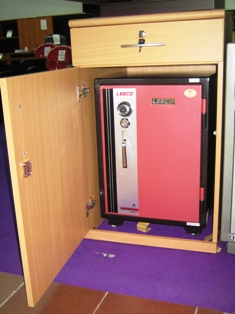 ตู้ครอบเซฟตู้ไม้ มีลิ้นชักบนล็อคกุญแจ และด้านล่างประตูบานเปิดทึบล็อคกุญแจ (ไม่มีพื้น)