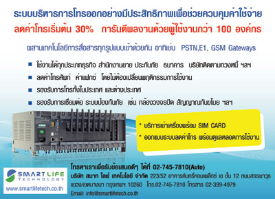 ผู้ผลิตและจำหน่ายอุปกรณ์แปลงสัญญาณโทรศัพท์มือถือ GSM/CDMA/VOIP GATEWAYS,IP PHONE และให้เช่าระบบลดค่าใช้จ่ายโทรศัพท์ในประเทศและต่างประเทศ สนใจติดต่อสอบถามรายละเอียดเพิ่มเติมได้ที่ บริษัท สมาท ไลฟ์ เทคโนโลยี จำกัด