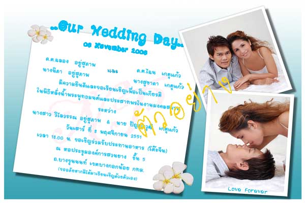 เพียงแค่คุณส่งไฟล์รูปมาทางเมล เราจะออกแบบและแก้ไขจนกว่าคุณจะพอใจ รวดเร็ว ทันใจ ภายใน 2 วันได้การ์ดไปชม