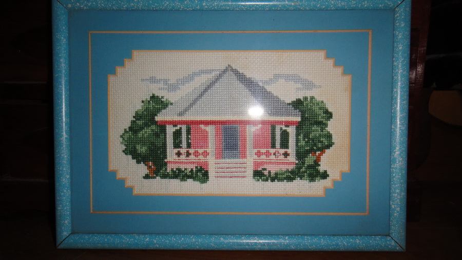 ขายภาพปักครอสติชรูปบ้านพร้อมกรอบสีฟ้าขนาด 27*19.5 ซม. ราคา 490 บาท