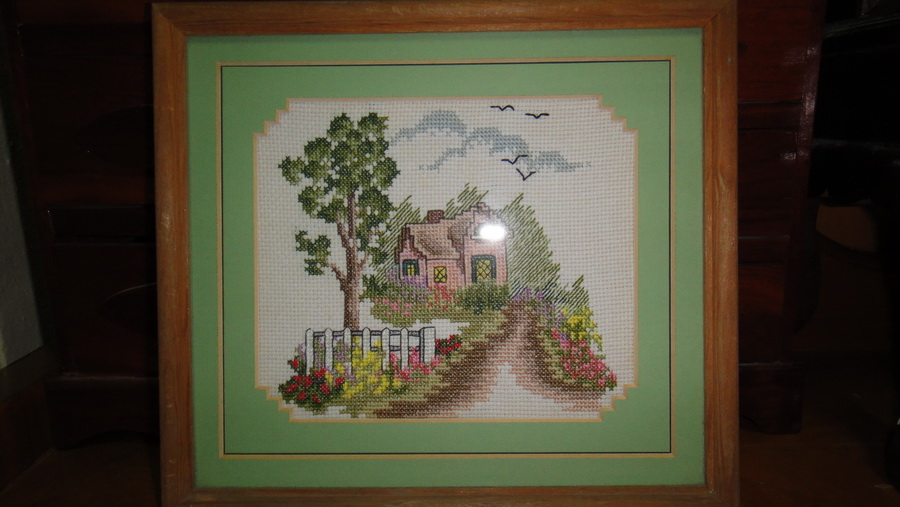 ขายภาพปักครอสติชรูปบ้านและสวนพร้อมกรอบสีเขียวขนาด 24.5*22 ซม. ราคา 550 บาท