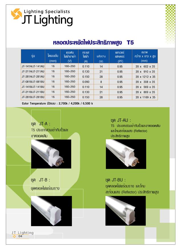 TAIWAN JT LIGHTING T5 วมลดภาวะโลกร้อนใช้หลอดผอม T5 หลอดT5 ประหยัดพลังงานได้ถึง 40-50 % บัลลาสต์อิเล็กทรอนิกส์(slim) ประหยัดไฟกว่า 40 % จำหน่ายหลอดไฟ T5 หลอดประหยัดพลังงาน 40-50% พร้อมอุปกรณ์ครบเซ็ท หลอดผอม T5 หลอดฟลูออเรสเซนต์ ประหยัดไฟประหยัดพลังงาน มีหลายรูปแบบให้เลือกเช่น โคมไฟโรงงาน โคมไฟถนน โคมไฟไฮเบ สูงถึง 8-15 เมตร โคม office ต่างๆ และชุดสำเร็จรูปเปลี่ยนใส่แทนหลอดธรรมดาได้ทันที