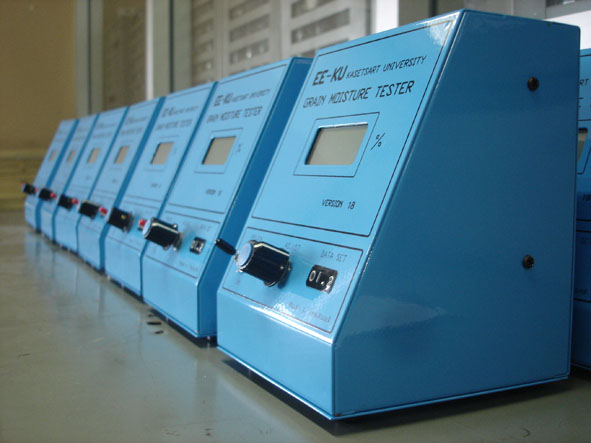 เครื่องวัดความชื้น EE-KU สำหรับหาความชื้นของเมล็ดพืชหรือวัสดุที่มีลักษณะเป็นเม็ดหรือผงพัฒนาโดยทีมวิจัย ภาควิชาวิศวกรรมไฟฟ้า คณะวิศวกรรมศาสตร์ มหาวิทยาลัยเกษตรศาสตร์ซึ่งมีรศ. ชัยวัฒน์ ชัยกุลเป็นหัวหน้าทีมวิจัย ได้ทำการวิจัยและพัฒนาตั้งแต่ปี2524จนถึงปัจจุบันทำให้เกษตรกรทั่วไปสามารถหาซื้อได้ง่าย ราคาถูกกว่าเครื่องที่มาจากต่างประเทศ แต่ความแม่นยำในการวัดไม่ได้ด้อยตามราคาเลย สามารถใช้วัดกับเมล็ดพืชที่มีปลูกอยู่ในประเทศไทยทุกชนิดหรือวัดวัสดุที่มีลักษณะเป็นเม็ดหรือผงได้ ซึ่งเป็นจุดเด่นที่หาไม่ได้ในเครื่องที่นำเข้าจากต่างประเทศ อีกทั้งเครื่องนี้ผลิตในประเทศไทยทำให้สามารถรับประกันการใช้งานและการบริการหลังการขายได้ตลอดอายุการใช้งานของเครื่อง เครื่องวัดความชื้นเมล็ดพันธ์นี้ได้ผ่านการพัฒนาและจำหน่ายมานานมากกว่า20ปีจนเป็นที่รู้จักและ มีการใช้งานแพร่หลายในกลุ่มบริษัทพืชผลและกลุ่มเกษตรกรทั่วไป เช่น กลุ่มผู้รับซื้อพืชผล โรงสีข้าว โรงงานผลิตอาหารสัตว์ กลุ่มเกษตรกรต่างๆ ส่วนราชการ นักวิชาการ และถูกนำไปใช้ต่างประเทศด้วยจำนวนหนึ่งเช่น จีน พม่า ลาว เวียดนาม ฟิลิปปินส์ บังกลาเทศ อินเดีย เป็นต้น