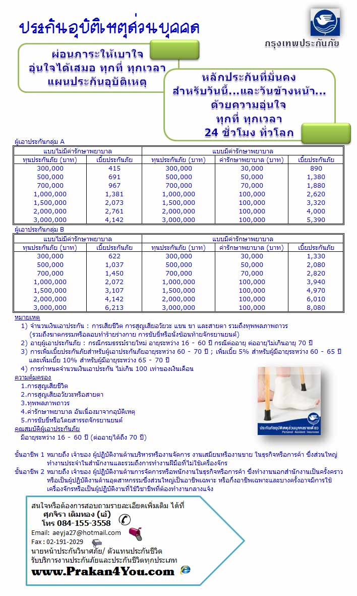 กรุงเทพประกันภัย ประกันอุบัติเหตุส่วนบุคคล ผ่อนภาระให้เบาใจ อุ่นใจได้เสมอ ทุกที่ ทุกเวลา /กับทุนประกันถึง 3ล้านบาท พร้อมค่ารักษาพยาบาลที่เลือกได้