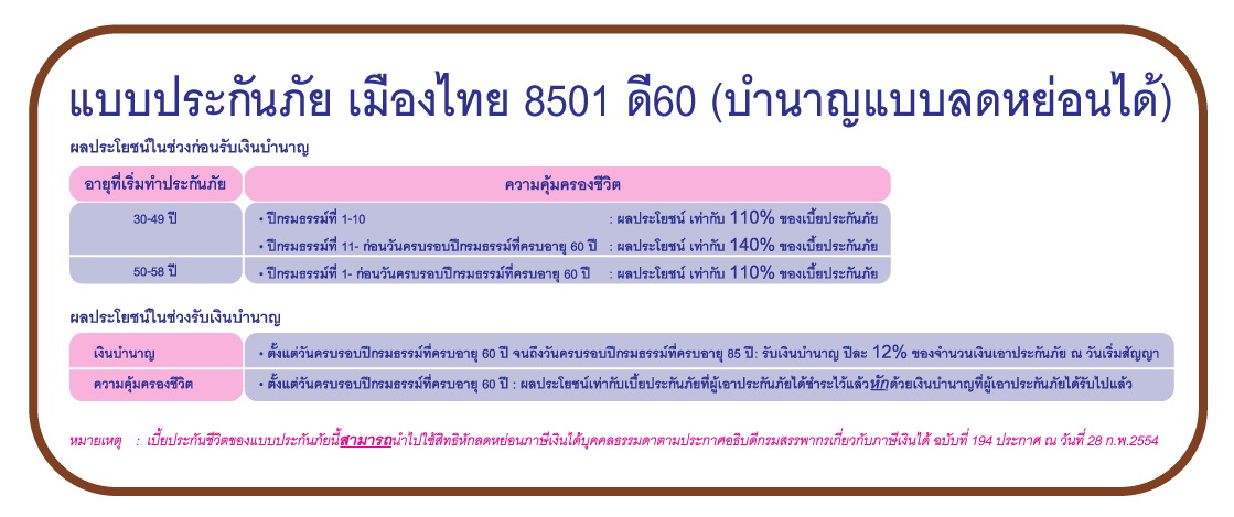 แบบประกันภัยเมืองไทย 8501 ดี55 (บำนาญแบบลดหย่อนได้) และ เมืองไทย 8501 ดี60 (บำนาญแบบลดหย่อนได้) ดีอย่างไร