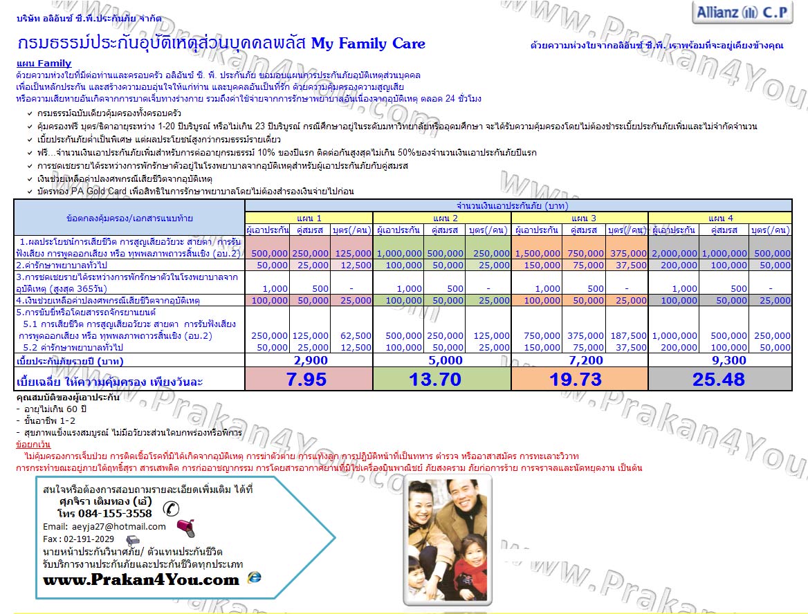 อลิอันซ์ ซี.พี. ประกันอุบัติเหตุสำหรับครอบครัว เริ่ม8บ/วัน คุ้มครอง5แสน ค่าพยาบาล5หมื่น คุ้มครองฟรีบุตร ชดเชยรายวัน ค่าปลงศพ เพิ่มทุนประกันภัยให้ทุกปี 3