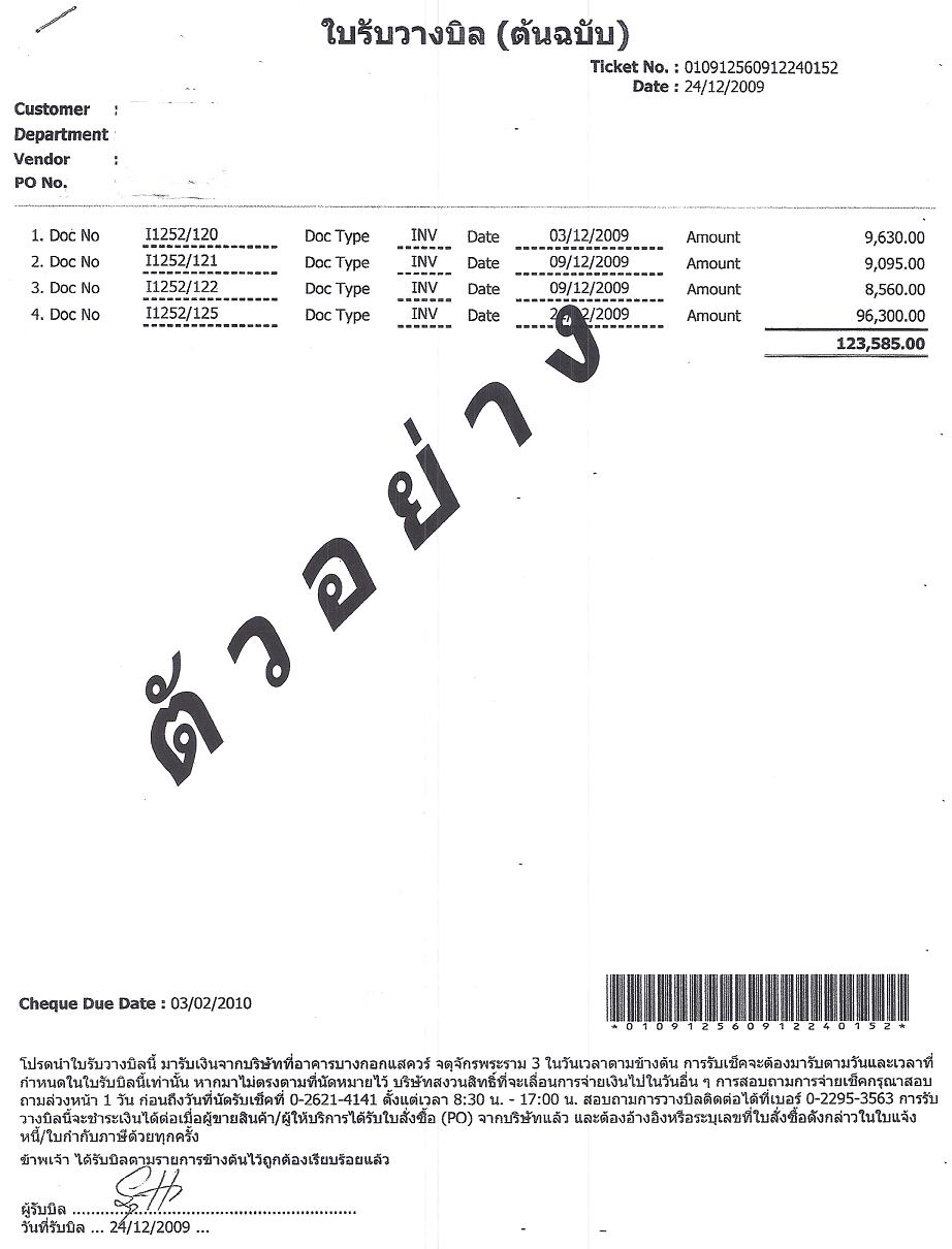 1.ใบวางบิล/ใบแจ้งหนี้ พร้อม วันที่ระบุนัดไปเก็บเช็คหรือรับเช็ค