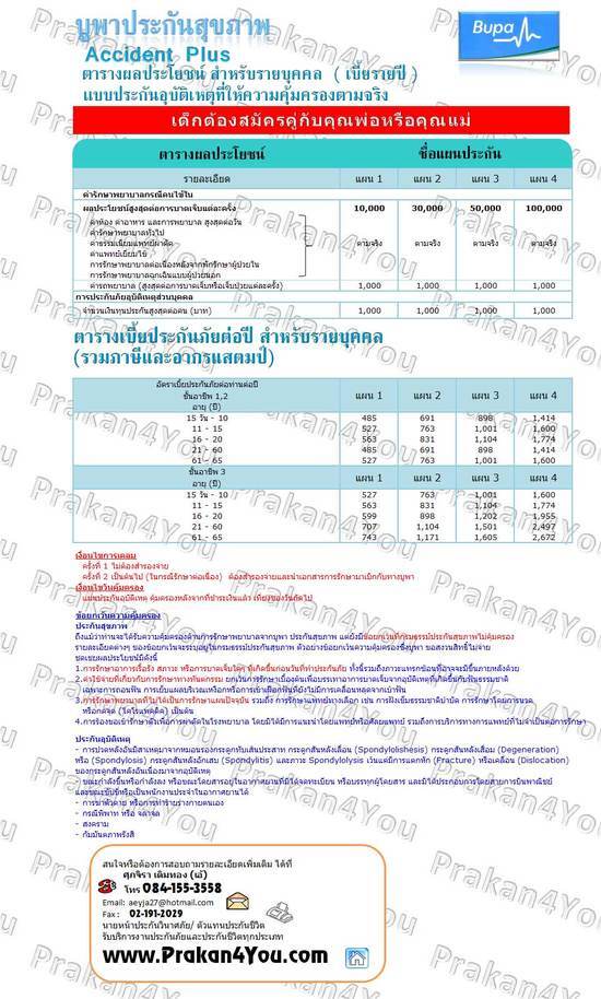 บูพาประกันสุขภาพ Accident Plus แบบประกันอุบัติเหตุ ตั้งแต่แรกเกิด ที่ให้ความคุ้มครองการรักษาพยาบาลให้ตามจริง สูงสุดถึง 1แสนต่อครั้ง เริ่มต้นที่ 1414บาทต่อปี